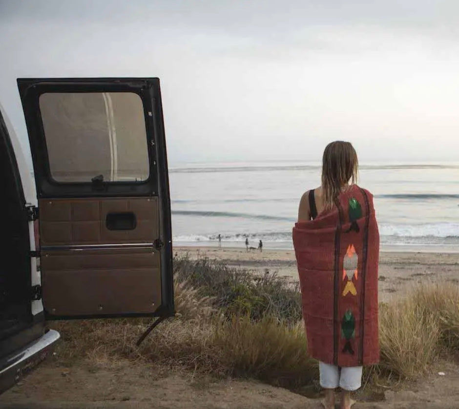 50% Acrylic, 40% Polyester, 10% Cotton - Machine washable - Handmade in Mexico. Our fish-design blankets are some of the thickest blankets we offer. Perfect for picnic, camping, yoga, or home throw. They also make large beach blankets for you sunbathing mermaids & surfers. These unique blankets are sometimes referred to as Thunderbird Blankets or Navajo blankets since they require the same specialized weaving to get the fish designs into the blanket.