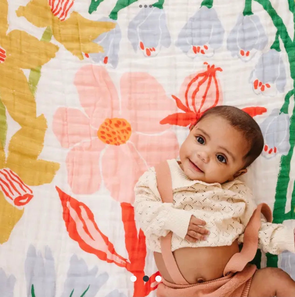 47x47 inches. Made of 100% cotton muslin and only gets softer with time. Never bleached. Machine washable.
