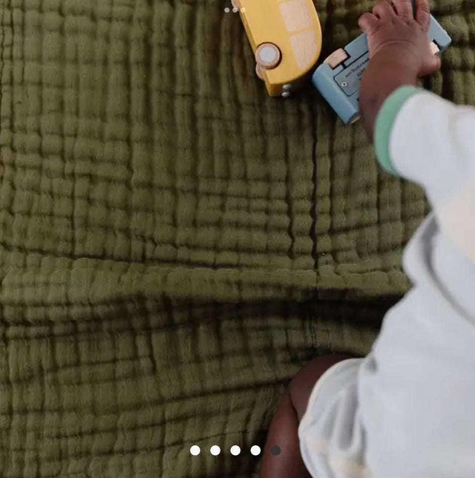 Four layers of muslin come together in a breathable but warm quilt perfect for babies, toddlers, cribs, play time, picnics, and pictures. 47x47 inches. Made of 100% cotton muslin, and only gets softer with time. Never bleached. Machine washable.
