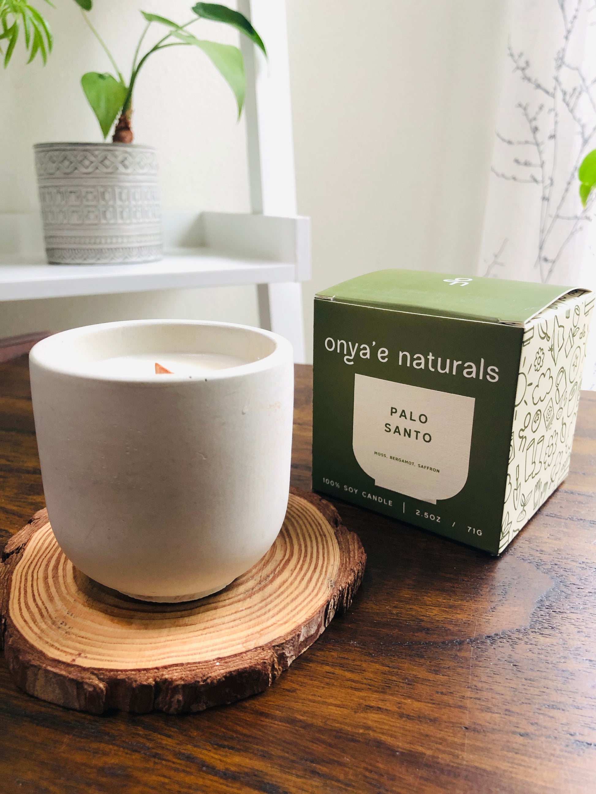 Moss, Bergamot, and Saffron make up this custom handcrafted Palo Santo candle