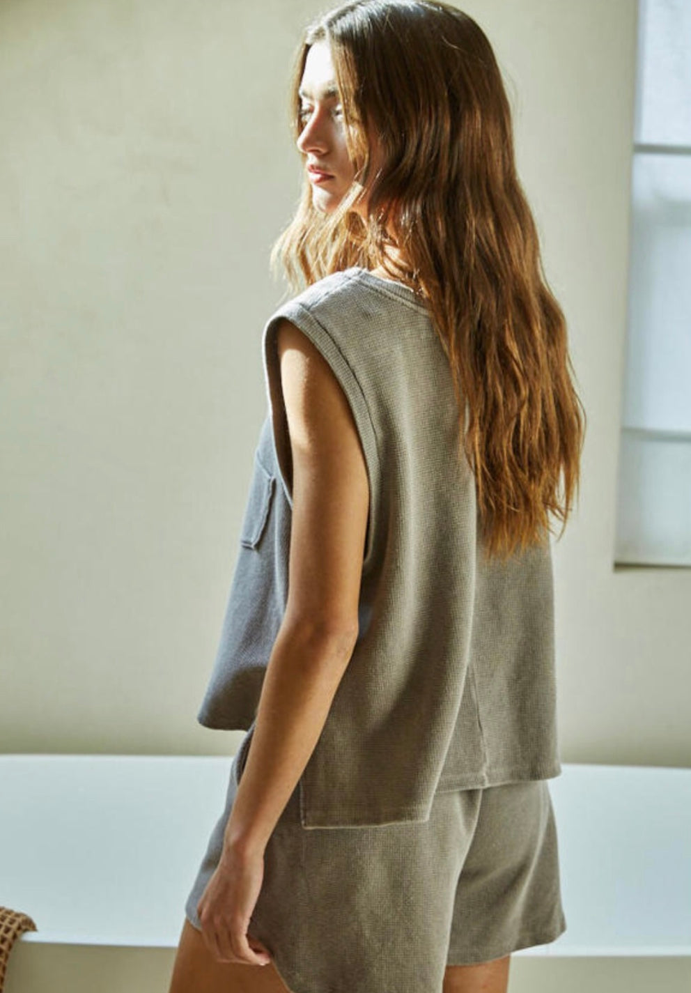 Thermal Scoop Neck Sleeveless Tee | Front Pocket | Side Slits | Hi Low Hem